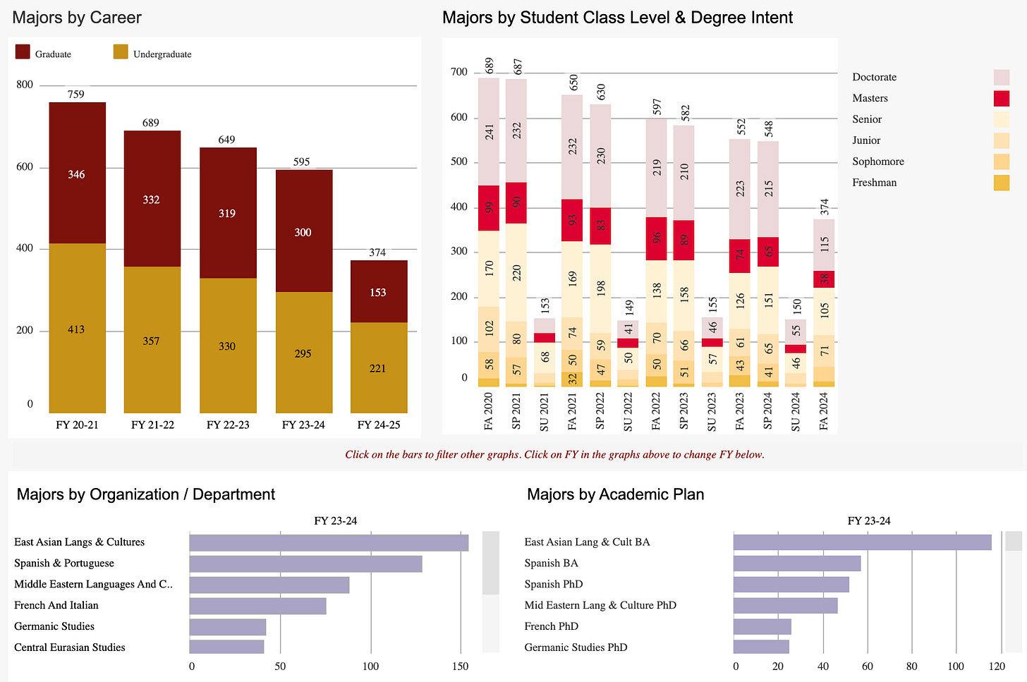 While that relative intensity doesn’t hold true for the “Slavic” major, I have an idea of why. There are currently only 21 students majoring in the Slavic and East European Languages and Culture program. This is likely why the Russian program cannot break off as its own major. So while Russian is the only “advanced” track available, its status “pulls up” the combined major.