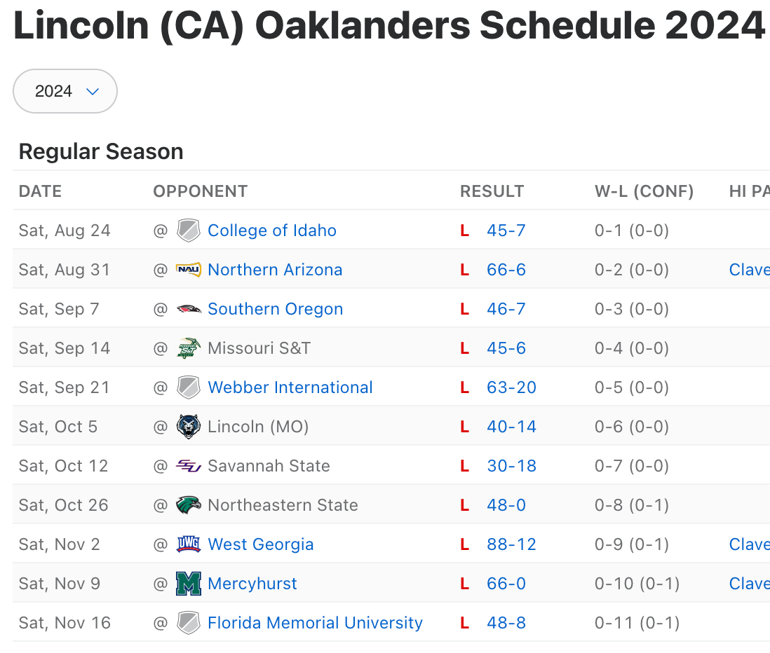 Here’s a fun fact: Lincoln University (Oakland) started a football team for the first time in 2021. They’ve won 3 games since then and none in the past two years.